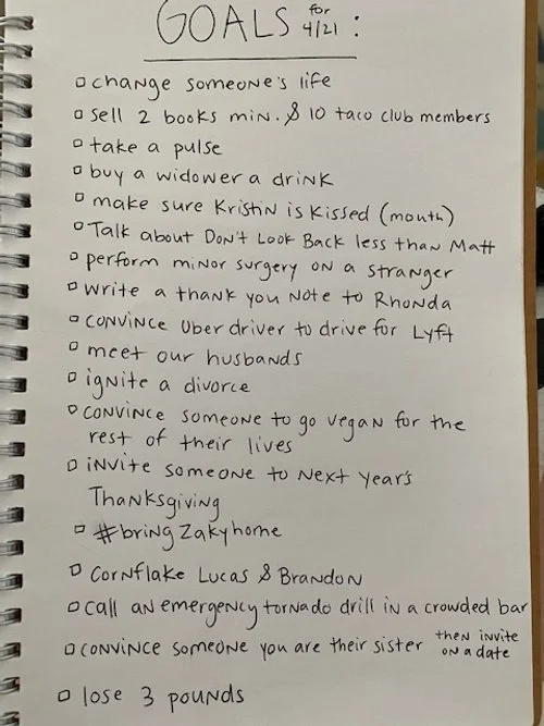 found - goals for one night, April 21st. attn: ignite a divorce; convince someone you are their sister then invite on a date; lose 3 pounds